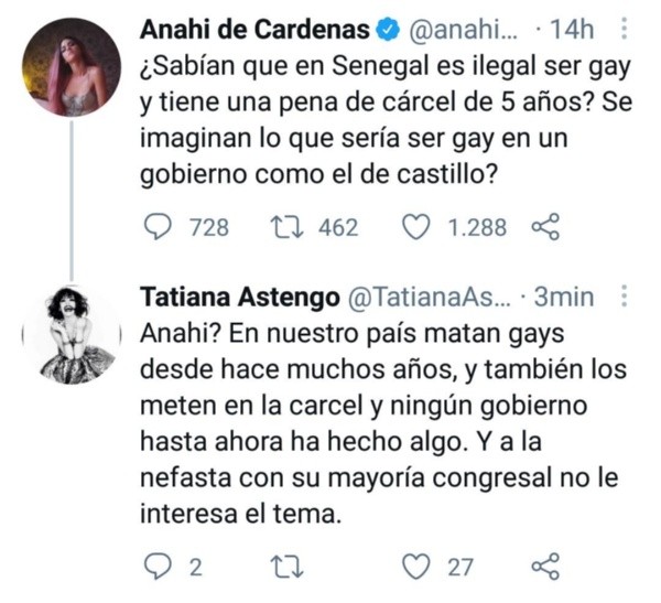 Las críticas, por estos dos comentarios, obviamente, llegaron por montón. Tatiana Astengo hizo lo suyo: “Anahi? En nuestro país matan gays desde hace muchos años, y también los meten en la carcel y ningún gobierno hasta ahora ha hecho algo. Y a la nefasta con su mayoría congresal no le interesa el tema”.