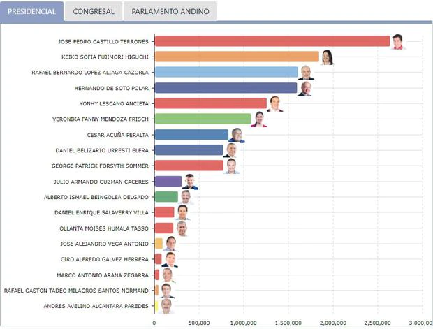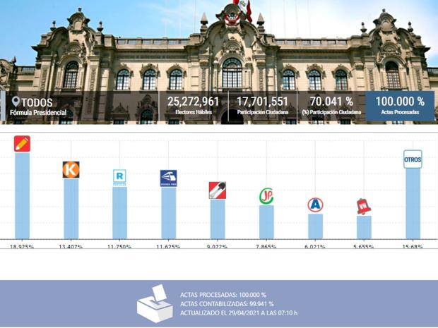 Los resultados emitidos por la ONPE se actualizaron hace un tiempo atrás. Pedro Castillo (Perú Libre) obtuvo el 18.925% (2,724,498 votos). Keiko Fujimori (Fuerza Popular) llegó al 13.407% (1,930,121 votos). Siendo ambos los calificados para la segunda vuelta (domingo 6 de junio).