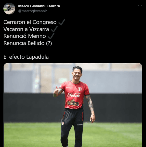 “Cerraron el Congreso. Vacaron a Vizcarra. Renunció Merino. Renuncia Bellido. El efecto Lapadula”. En otras palabras, se podría hasta considerar a Gianluca Lapadula como ‘el terror del Poder Ejecutivo’, esto también lo mencionan en las redes sociales. Ahora solo esperan que baje el dólar, para prenderle una ‘velitas’ al santo nacido en Italia. Je.