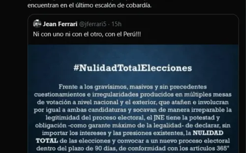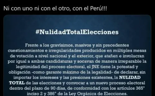 “Frente a los gravísimos, masivos y sin precedentes cuestionamientos e irregularidades producidos en múltiples mesas de votación a nivel nacional y el exterior, que atañen e involucran por igual a ambas candidaturas y socavan de manera irreparable la legitimidad del proceso electoral, el JNE tiene la potestad y obligación -como garante máximo de la legalidad- de declarar, sin importar los intereses y las presiones existentes, la NULIDAD TOTAL de las elecciones y convocar a un nuevo proceso electoral dentro del plazo de 90 días, de conformidad con los artículos 365° inciso 2 y 386° de la Ley Orgánica de Elecciones”.