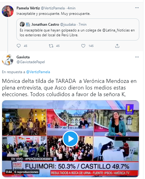 Publicando en Twitter el fragmento del vídeo, señalando el insulto de la periodista y presentadora del programa político en Latina Televisión, hacia Verónica Mendoza. Generando obviamente, una reacción masiva.