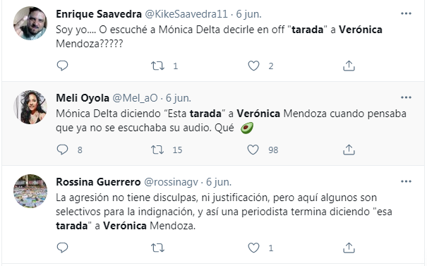 Ahí se escuchó supuestamente la polémica frase de Mónica Delta, de quien se oye su voz, pero se desconoce a quien se lo dice o señala el supuesto insulto. Los usuarios en redes sociales no dudaron en atacarla, afirmando que era contra Mendoza.