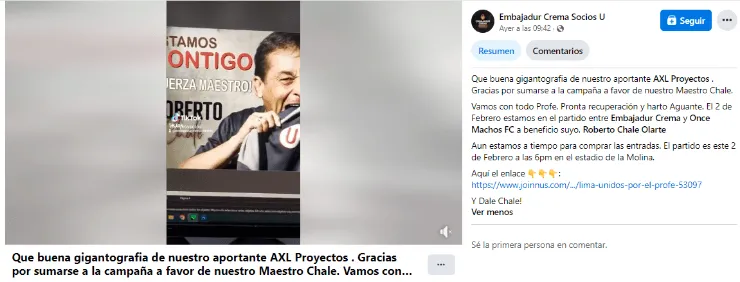 Además, se supo que la ayuda que se dará, será mediante un partido de exhibición, entre Embajador Crema y Once Machos, equipo encabezado por el actor Aldo Miyashiro. Este encuentro se desarrollará este jueves 02 de febrero a las 6 p.m. en el estadio Municipal de La Molina, recinto que cuenta con la capacidad de 5 mil personas.