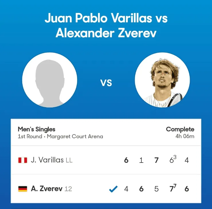 Juan Pablo Varillas enfrentó al alemánAlexander Zverev por la primera ronda del Abierto de Australia 2023. El peruano tuvo ungran desempeño y luchó de principio a fin, pero terminó cayendo 2-3 con parciales de 6-4, 1-6, 7-5, 6-7 y 4-6.