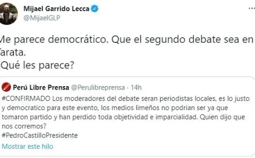 “Me parece democrático. Que el segundo debate sea en Tarata. ¿Qué les parece?”, escribió el periodista. El mensaje recibió muchos cuestionamientos debido a que el lugar fue atacado por terrorismo.