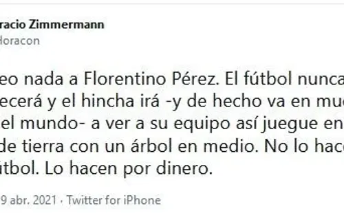 Este lunes, por ejemplo, apuntó contra el presidente del Real Madrid: “No le creo nada a Florentino Pérez. El fútbol nunca desaparecerá y el hincha irá -y de hecho va en muchas partes del mundo- a ver a su equipo así juegue en una cancha de tierra con un árbol en medio. No lo hacen por el fútbol. Lo hacen por dinero”.