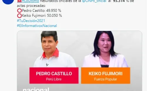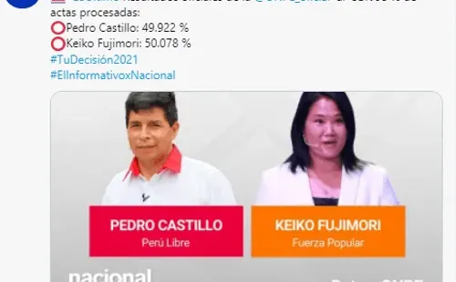 Conoce los resultados oficiales emitidos por la ONPE. Pedro Castillo, de Perú Libre, mantiene su ventaja sobre la candidata de Fuerza Popular Keiko Fujimori.