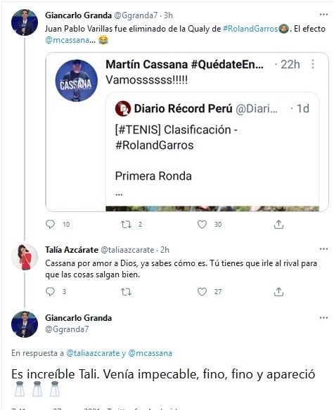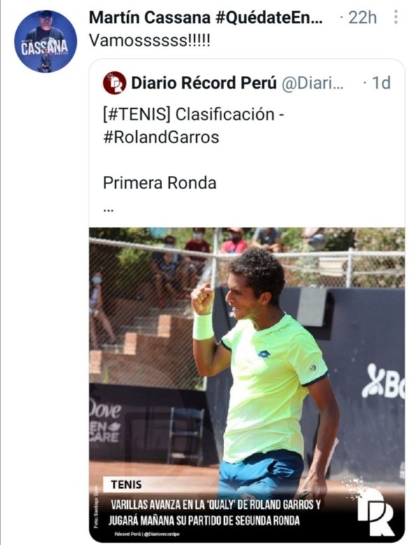“Juan Pablo Varillas fue eliminado de la Qualy de #RolandGarros. El efecto Cassana…”, escribió el comunicador junto con la captura de una de las publicaciones del otro periodista.