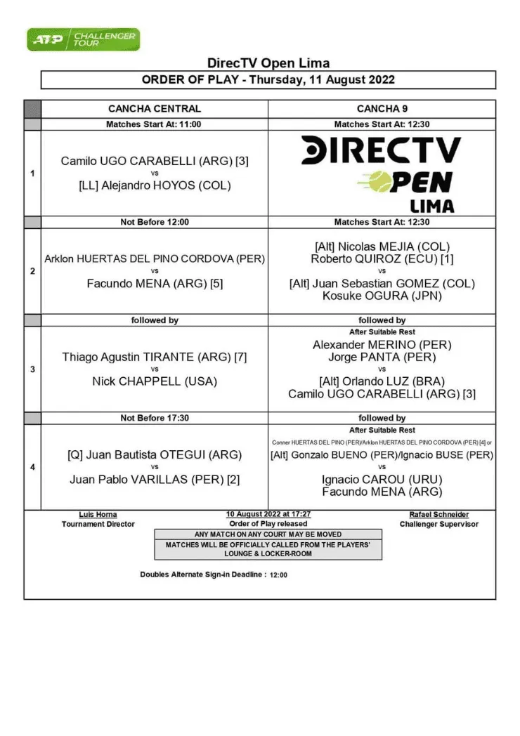 Programación del Directv Open Lima deeste jueves 11 de agosto
