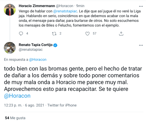 “Vengo de hablar con Renato Tapia. Le dije que así jugue él no veré la Liga jaja. Hablando en serio, coincidimos en que debemos acabar con la mala onda, el mensaje para dañar, para burlarse de otros. No solo escuchemos los mensajes de Biles o Felucho, fomentemos con el ejemplo”, apuntó el de Movistar Deportes.