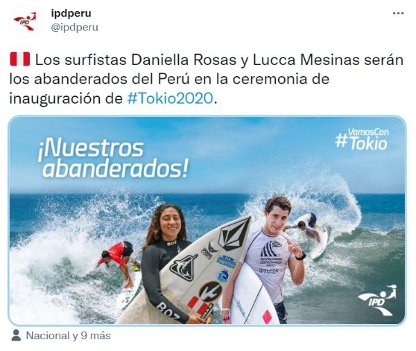 Tanto Daniella Rosas como Lucca Mesinas han sido medalla de oro en los Juegos Panamericanos 2019. Ambos deportistas serán, por primera vez en su carrera deportiva, abanderados de Perú en unos Juegos Olímpicos. Sin duda esto será un gran honor y experiencia para los surfistas.