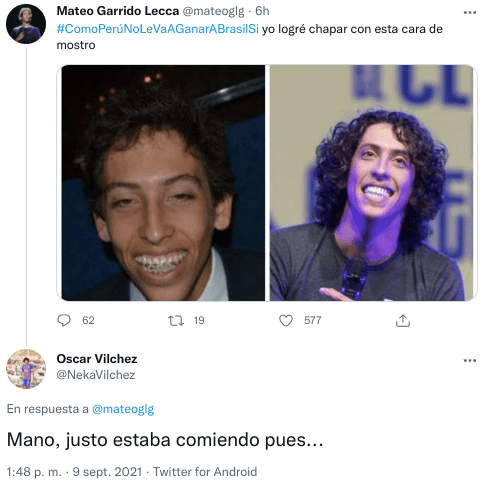 “#ComoPerúNoLeVaAGanarABrasilSi yo logré chapar con esta cara de mostro“, escribió junto a un par de fotos suyas. En una sale de más joven con frenillos. En la segunda, está más grande y adulto. Igual, tampoco destaca por su belleza.
