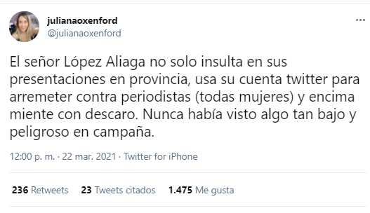 “El señor López Aliaga no solo insulta en sus presentaciones en provincia, usa su cuenta twitter para arremeter contra periodistas (todas mujeres) y encima miente con descaro. Nunca había visto algo tan bajo y peligroso en campaña”, escribió la comunicadora de ATV.