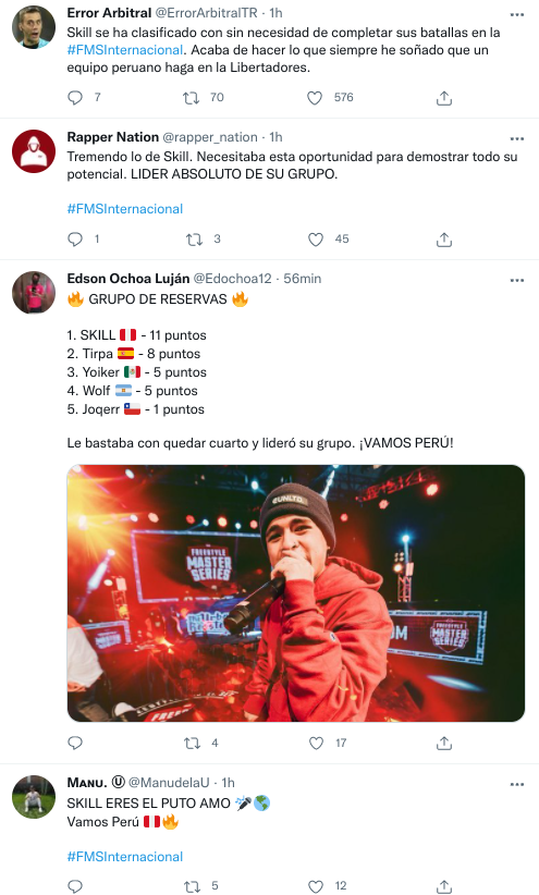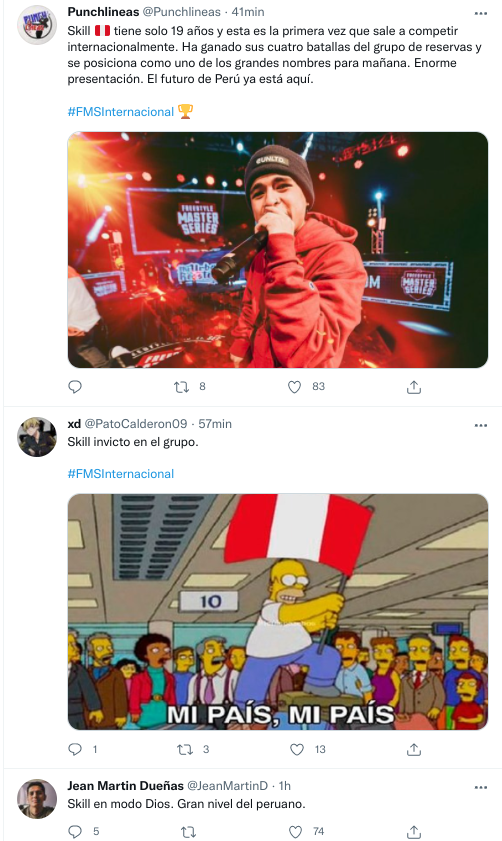 Lo mismo pasa con los raperos o en los concursos de Freestyle. Las audiencias son realmente masivas. Para tener una idea, la FMS Internacional de este jueves tiene más de doce mil menciones en twitter. Skill, un peruano, también ha sido muy mencionado.