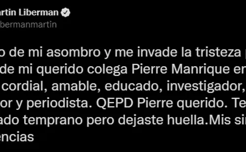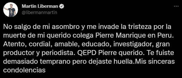 “No salgo de mi asombro y me invade la tristeza por la muerte de mi querido colega Pierre Manrique en Perú. Atento, cordial, amable, educado, investigador, gran productor y periodista. QEPD Pierre querido. Te fuiste demasiado temprano, pero dejaste huella. Mis sinceras condolencias”. Fue lo que mencionó el ex conductor de Fox Sports.