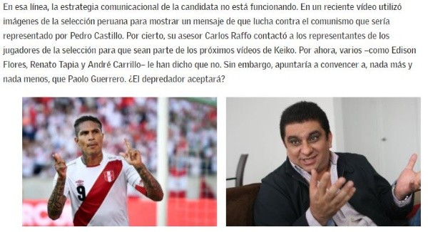 En medio del contexto político a poco de la segunda vuelta entre los candidatos Pedro Castillo del partido Perú Libre y Keiko Fujimori del partido Fuerza Popular, la web de la conocida revista Caretas informó que Carlos Raffo, asesor del partido de Keiko, contactó a representantes de futbolistas de la selección peruana “para que sean parte de los próximos vídeos de Keiko”.