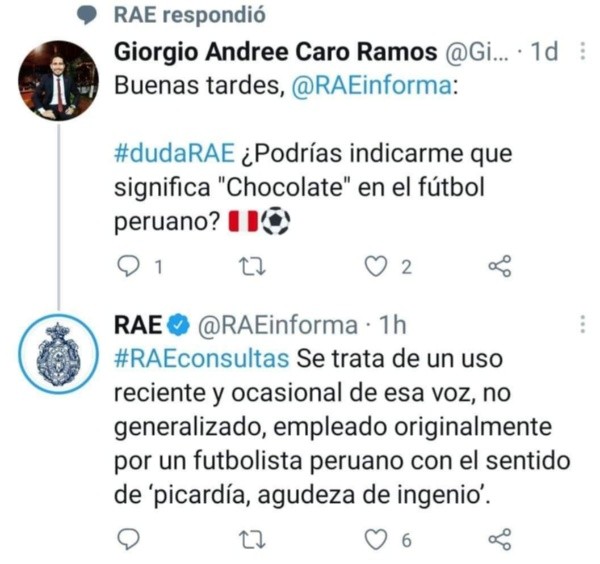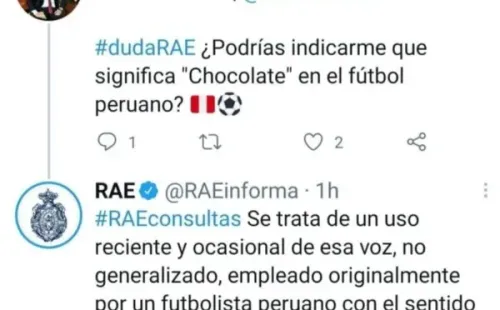Entonces, la propia RAE fue consultada al respecto: “¿Podrías indicarme que significa “Chocolate” en el fútbol peruano?”. “Se trata de un uso reciente y ocasional de esa voz, no generalizado, empleado originalmente por un futbolista peruano con el sentido de ‘picardía, agudeza de ingenio’.”, respondieron entonces desde la cuenta oficial de twitter. Todo quedó claro: HABEMUS DEFINICIÓN.