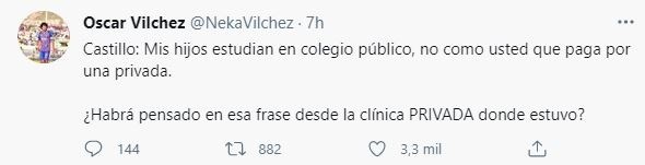 “Castillo: Mis hijos estudian en colegio público, no como usted que paga por una privada. ¿Habrá pensado en esa frase desde la clínica PRIVADA donde estuvo?”, escribió el también exjugador de la selección peruana.