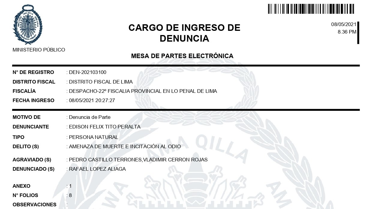 Según el documento presentado por Edison, el delito de Rafael López Aliaga es por amenaza de muerte e incitación al odio. Los comentarios de López Aliaga fueron realizados en la ‘Marcha por la Democracia’.