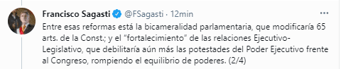 “Entre esas reformas está la bicameralidad parlamentaria, que modificaría 65 arts. de la Const.; y el “fortalecimiento” de las relaciones Ejecutivo-Legislativo, que debilitaría aún más las potestades del Poder Ejecutivo frente al Congreso, rompiendo el equilibrio de poderes”.