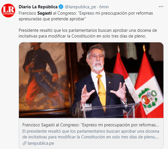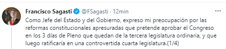 “Como Jefe del Estado y del Gobierno, expreso mi preocupación por las reformas constitucionales apresuradas que pretende aprobar el Congreso en los 3 días de Pleno que quedan de la tercera legislatura ordinaria, y que luego ratificaría en una controvertida cuarta legislatura”.
