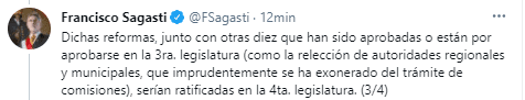 “Dichas reformas, junto con otras diez que han sido aprobadas o están por aprobarse en la 3ra. legislatura (como la relección de autoridades regionales y municipales, que imprudentemente se ha exonerado del trámite de comisiones), serían ratificadas en la 4ta. legislatura”.