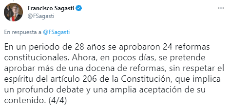 “En un periodo de 28 años se aprobaron 24 reformas constitucionales. Ahora, en pocos días, se pretende aprobar más de una docena de reformas, sin respetar el espíritu del artículo 206 de la Constitución, que implica un profundo debate y una amplia aceptación de su contenido”.