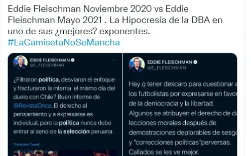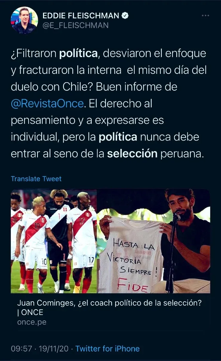 Pero con lo que no contaba el periodista deportivo, era con una serie de capturas pasadas, donde era muy frontal en sus comentarios frente a un hecho protagonizado por Juan Comingues, el coaching de la Selección Peruana, quien habría dado una charla política previo al duelo contra Chile en Santiago.