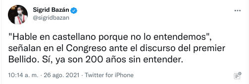 “”Hable en castellano porque no lo entendemos”, señalan en el Congreso ante el discurso del premier Bellido. Sí, ya son 200 años sin entender”, comezó. “Lima es la ciudad que más quechua hablantes concentra. Más de 700 mil ciudadanos que viven en la capital la reconocen como lengua. No se puede representar desde el griterío y el desconocimiento, colegas de Fuerza Popular”, señaló luego en otro tweet.