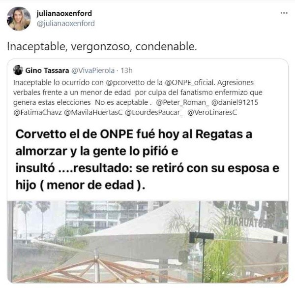 Esto, obviamente, generó el rechazo de distintas figuras que ni si quiera tienen que ver con un partido o el otro. Juliana Oxenford, por ejemplo, escribió: “Inaceptable, vergonzoso, condenable”.