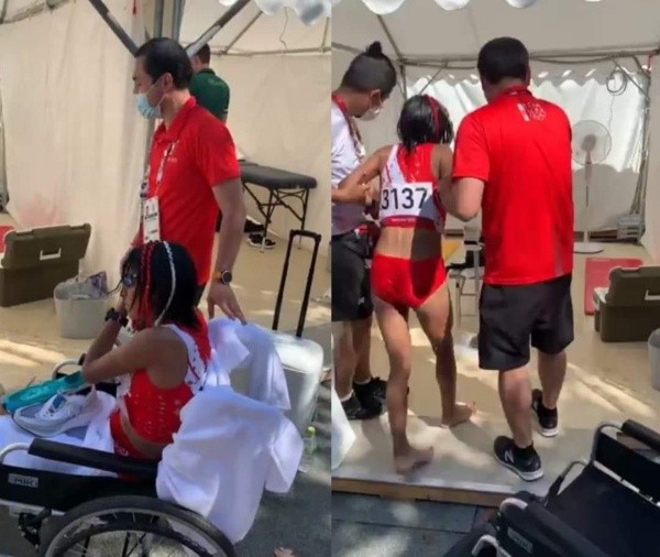 Al finalizar la carrera, que consta de 42.195 km, un recorrido bastante extenso y por le cual las deportistas trabajan años para poder correr este circuito en los Juegos Olímpicos. Se pudo ver una imagen de Gladys Tejeda sentada en una silla de ruedas, tras la carrera, y también se visualiza como la ayudan para poder caminar y movilizarse.