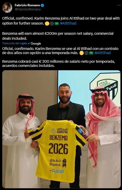 Lo que cuenta el popular, Here we go: “Oficial, confirmado. Karim Benzema se une al Al Ittihad con un contrato de dos años con opción a una temporada más. Benzema cobrará casi € 200 millones de salario neto por temporada, acuerdos comerciales incluidos”. ¿Cualquiera se iría por esa mejora a un fútbol en evolución? Entendemos que sí.