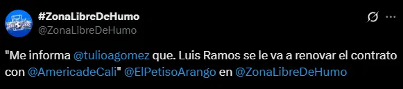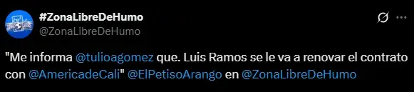 “Me informa Tulio Gómez que a Luis Ramos se le va a renovar el contrato con América de Cali”, fue lo que pudo dar a conocer el periodista Carlos Arturo Arango en Zona Libre de Humo.