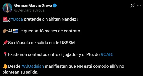 Según lo que se ha podido conocer, Boca Juniors tiene en carpeta el nombre de Nahitan Nández. El uruguayo es una de las tentaciones que tiene Juan Román Riquelme para reforzar el equipo el próximo año. Si bien está jugando en el Al-Qadsiah y tiene contrato vigente, ya se ha dado un acercamiento para conocer un poco más su situación.