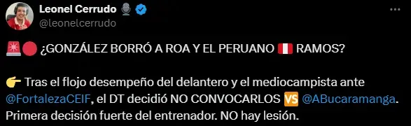 En Colombia se ha podido conocer que Luis Ramos no fue convocado para el duelo frente a Atlético Bucaramanga. Esto no se debe a una lesión, por lo que se interpreta como gusto del DT que no lo ve con buenos ojos al peruano. Pues, en el último partido solo jugó 45 minutos, ya que no hizo un buen juego y terminó siendo cambiado en el inicio del segundo tiempo.