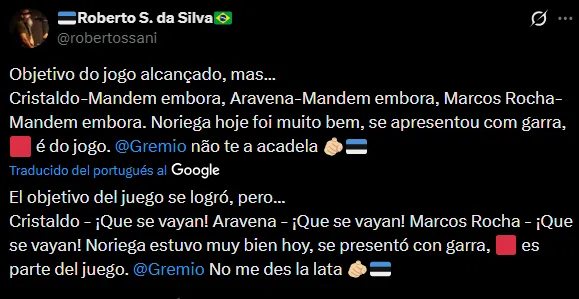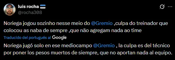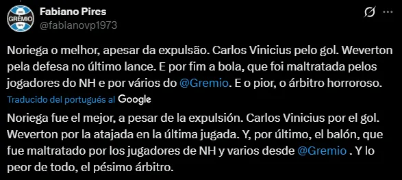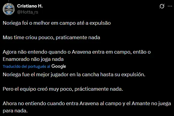 “Jugó solo“, “fue el mejor, pese a la expulsión“, “dominó el mediocampo en solitario” son algunos de los tantos comentarios en favor de Erick Noriega por su actuación ante Novo Hamburgo. Aún con la tarjeta roja, las opiniones apuntaron más a su desempeño general.