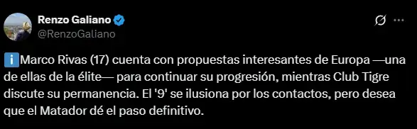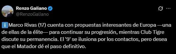 La joven perla peruana de tan solo 17 años de edad viene jugando en Tigre, club que viene siendo apretado por los hinchas para que puedan darle un contrato profesional y así asegurarlo. Pero por ahora el elenco ‘Matador’ no ha decidido que hacer con él. Lo que si se ha conocido es que está muy pronto a hacer su debut profesional pues ya lo tienen pensado usar en el primer equipo.