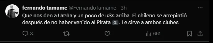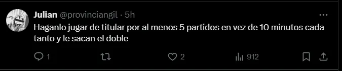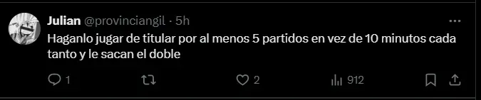 “Háganlo jugar de titular por al menos 5 partidos en vez de 10 minutos cada tanto y le sacan el doble”, “Según Transfermarkt, el ‘man’ vale 2.5M y lo van a vender a 900k. Véndalo a Brasil o a una liga de Europa de segundo orden”, “Que nos den a Ureña y un poco de u$s arriba. El chileno se arrepintió después de no haber venido al Pirata. Le sirve a ambos clubes” y “Nadie va pagar ese dinero por alguien sin mucha continuidad”; son algunas de las reacciones de los hinchas del Belgrano de Córdoba ante el caso de Bryan Reyna.