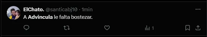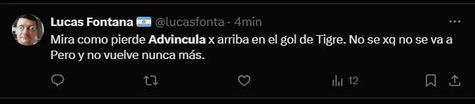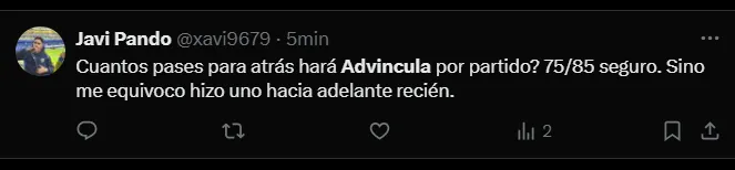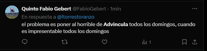 “Advíncula no hace nada, es horrible el peruano, se tiene que ir ya”, “El problema es poner al horrible de Advíncula todos los domingos cuando es impresentable todos los domingos”, “A Advíncula le falta bostezar”, “Mira como pierde Advíncula por arriba en el gol de Tigre. No se por qué no se va y no vuelve nunca más” y “¿Cuántos pases para atrás hará Advíncula por partido? 75/85 seguro. Si no me equivoco hizo uno hacia adelante recién”; comentaron los hinchas.