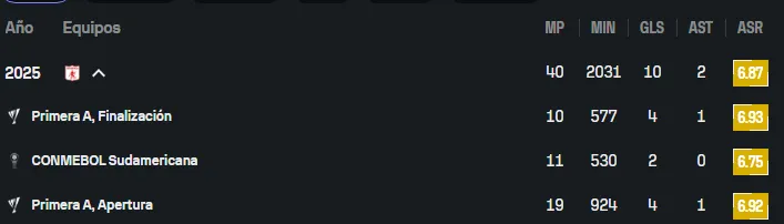 Todo el 2025 ha sabido ganarse sus oportunidades en el cuadro de América de Cali, en donde ya lleva disputado un total de 40 partidos, marcando 10 goles y dando 2 asistencias en 2031 minutos. Quizás no sean las mejores cifras que tenga hasta la fecha, pero para ser su primera experiencia en el extranjero, viene haciendo las cosas bien.