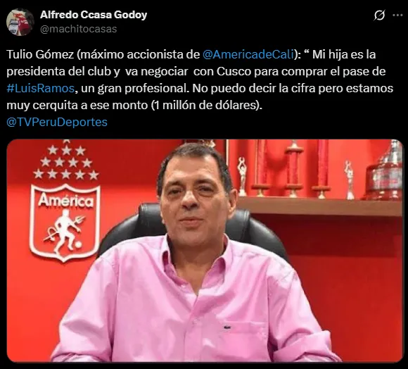 Tulio Gómez, quien es el máximo accionista de América de Cali, habló sobre la decisión sobre el atacante nacional. El periodista Alfredo Ccasa en sus redes sociales, compartió estas declaraciones en las que deja en claro que buscan quedarse con Ramos. Hablando monetariamente, están dispuestos a pagar la suma de 1 millón de dólares por el 9 nacional.