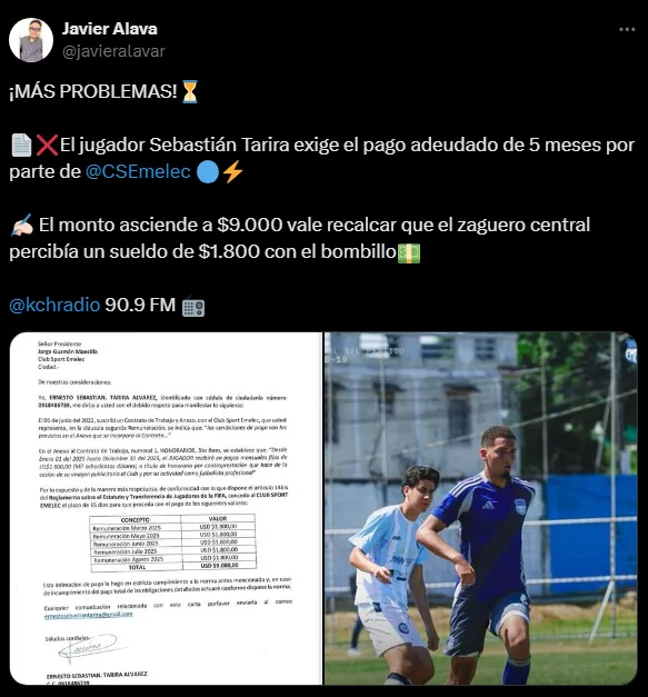 El periodista Javier Alava dio a conocer en sus redes sociales el caso de Sebastián Tarira, quien en estos momentos está haciendo la exigencia de su sueldo. Estamos hablando que le adeudan la suma de 9 mil dólares, 1,8 por mes que no ha podido cobrar el futbolista. Dejando en evidencia la situación que está pasando en este momento el club.