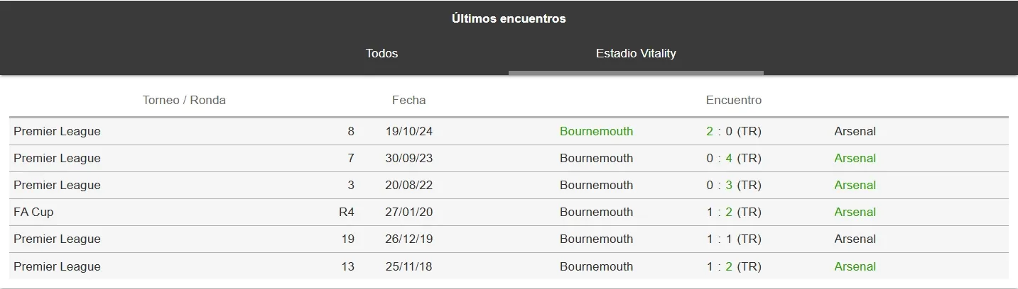 Repasamos los últimos resultados del Arsenal vs. Bournemouth en el Vitality Stadium, donde el local se quedó con la victoria más reciente.