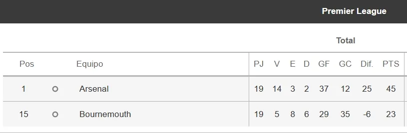 Arsenal pelea por seguir en el primer puesto de la tabla de posiciones de la Premier League, mientras que Bournemouth lucha por salir del fondo.