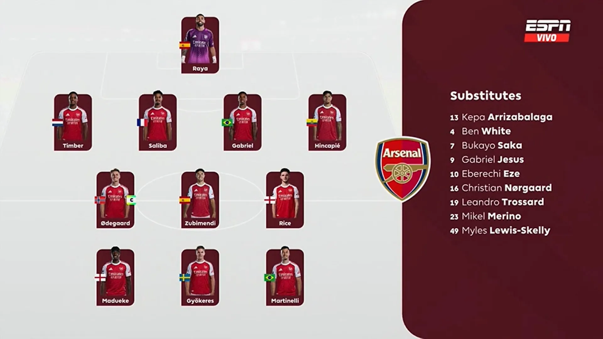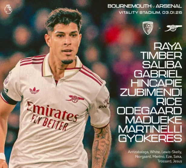 Arsenal: David Raya; Jurrien Timber, William Saliba, Gabriel Magalhaes, Piero Hincapié; Martín Odegaard, Martín Zubimendi, Mikel Merino; Bukayo Saka, Viktor Gyokeres, Leandro Trossard.