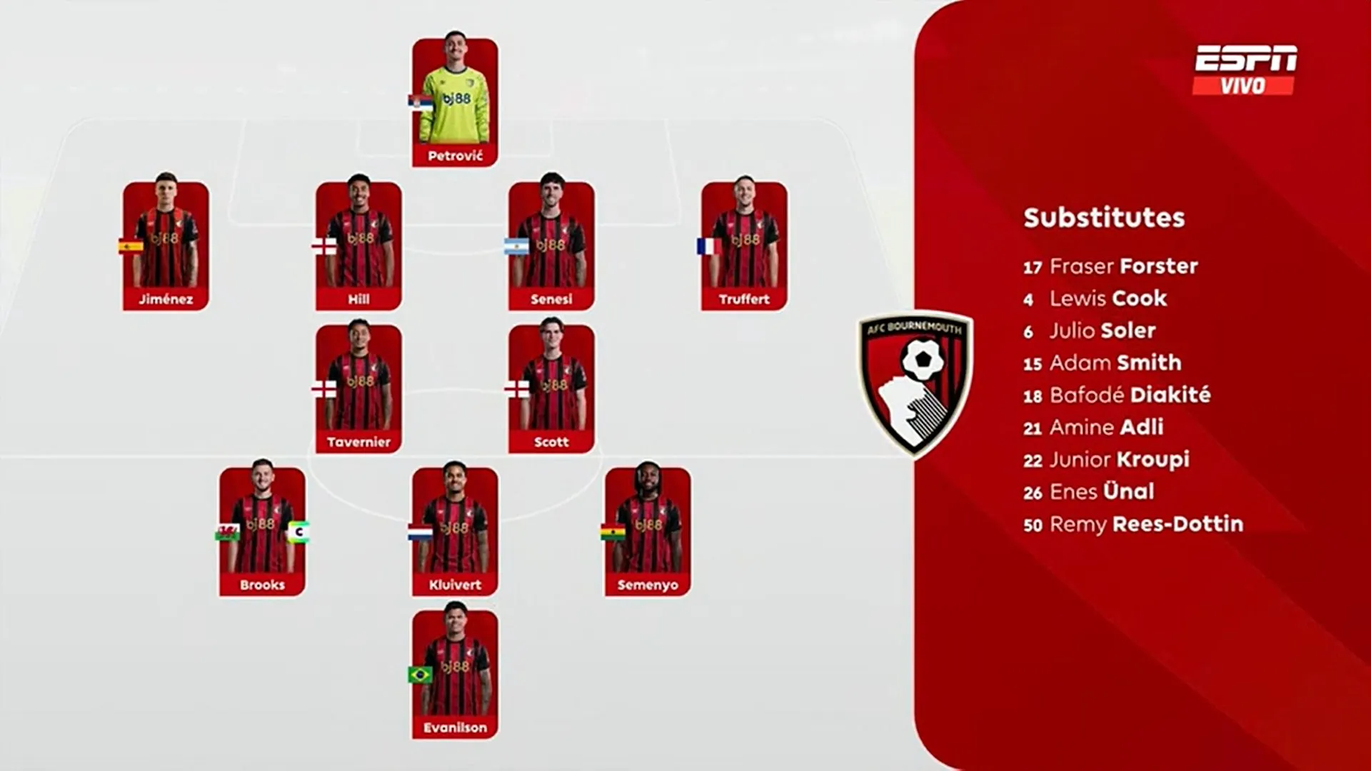 Bournemouth: Djordje Petrovic; Álex Jiménez, James Hill, Marcos Senesi, Adrien Truffert; Marcus Tavernier, Alex Scott, David Brooks, Antoine Semenyo; Justin Kluivert, Evanilson.
