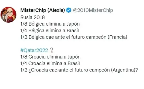 Partiendo del Mundial de Rusia 2018, Misterchip sostiene la teoría que en ese torneo una serie de eventos determinaron que Francia se lleve la Copa del Mundo tras vencer a Bélgica en las semifinales. Haciendo más extraña la casualidad, Bélgica venía de vencer a Japón en octavos y Brasil en cuartos, tal y como lo ha realizado ahora Croacia.
