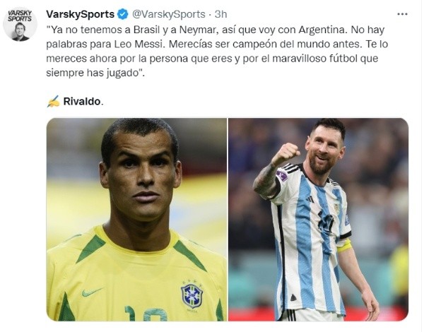 “Ya no tenemos a Brasil ni a Neymar en esta final de Copa, así que me quedo con Argentina. Sin palabras para ti Leo Messi. Ya merecías ser campeón del mundo antes, pero Dios sabe todas las cosas y te coronará este domingo”, compartió Rivaldo a través de sus redes sociales.