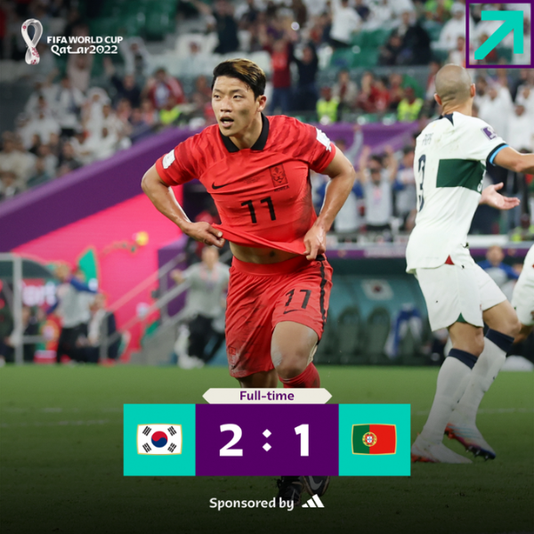 Los goles de Kim Young-Gwon y Hwang Hee-chan hacen que Corea del Sur se meta a la siguiente fase del torneo Mundial Qatar 2022. El descuento fue anotado por Ricardo Horta, en la primera mitad. Lo sufre Uruguay, que aun ganando, se terminó quedando fuera por diferencia de goles.