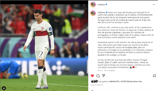 El final parece estar a la vuelta de la esquina, y poco a poco se va haciendo una idea. Cristiano Ronaldo conmueve al mundo con una pluma muy sentida, fina, junto a un mensaje que podría tomarse como un hasta pronto. El delantero luso hasta este momento no había tenido opinión con respecto a la eliminación de Portugal ante Marruecos.